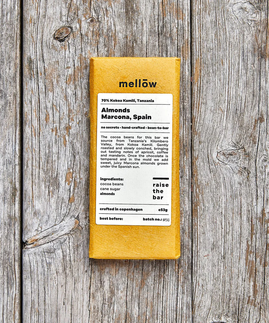 Økologisk chokoladebar fra Mellow med søde og saftige spanske Marcona mandler og med kakaobønner fra Mbingu Village, Tanzania.